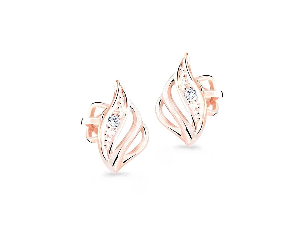 Elegantní náušnice pecky z růžového 14k zlata na šroubek osazené zářivými zirkony. Rozměry náušnic najdete vyobrazené na podpůrné fotografii.