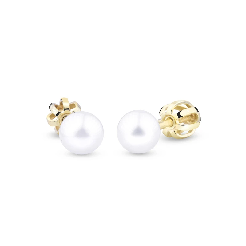 Náušnice s kultivovanou říční perlou ze žlutého zlata ryzosti 585/1000. Osazené říční perly jsou v kvalitě AAA. Perličky mají průměr 5mm. Náušnicové zapínání je na šroubek