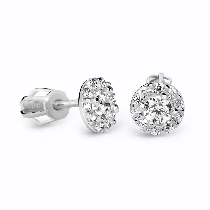 Zlaté náušnice se zirkony vyrobené z bílého zlata 585/000. Průměr ozdoby náušnic 5,5 mm. Náušnicové zapínání na je na šroubek. Průměr náušnicového zapínání 4 mm.