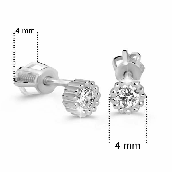 Zlaté náušnice se zirkony vyrobené z bílého zlata 585/000. Průměr ozdoby náušnic 4 mm. Náušnicové zapínání na je na šroubek. Průměr náušnicového zapínání 4 mm.