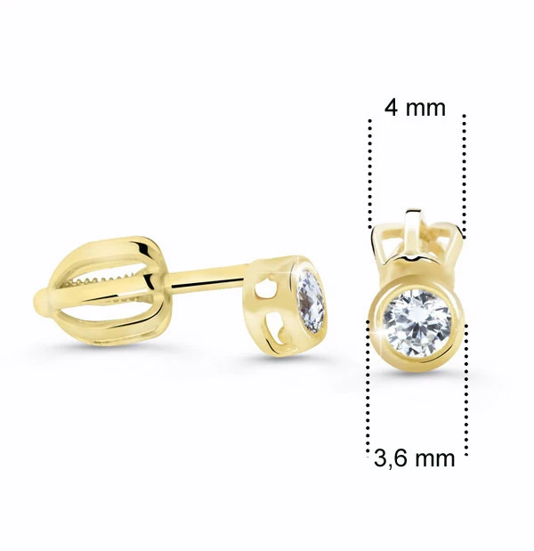 Zlaté náušnice se zirkony vyrobené ze žlutého zlata 585/000. Průměr ozdoby náušnic 3,6 mm. Náušnicové zapínání na je na šroubek. Průměr náušnicového zapínání 4 mm.