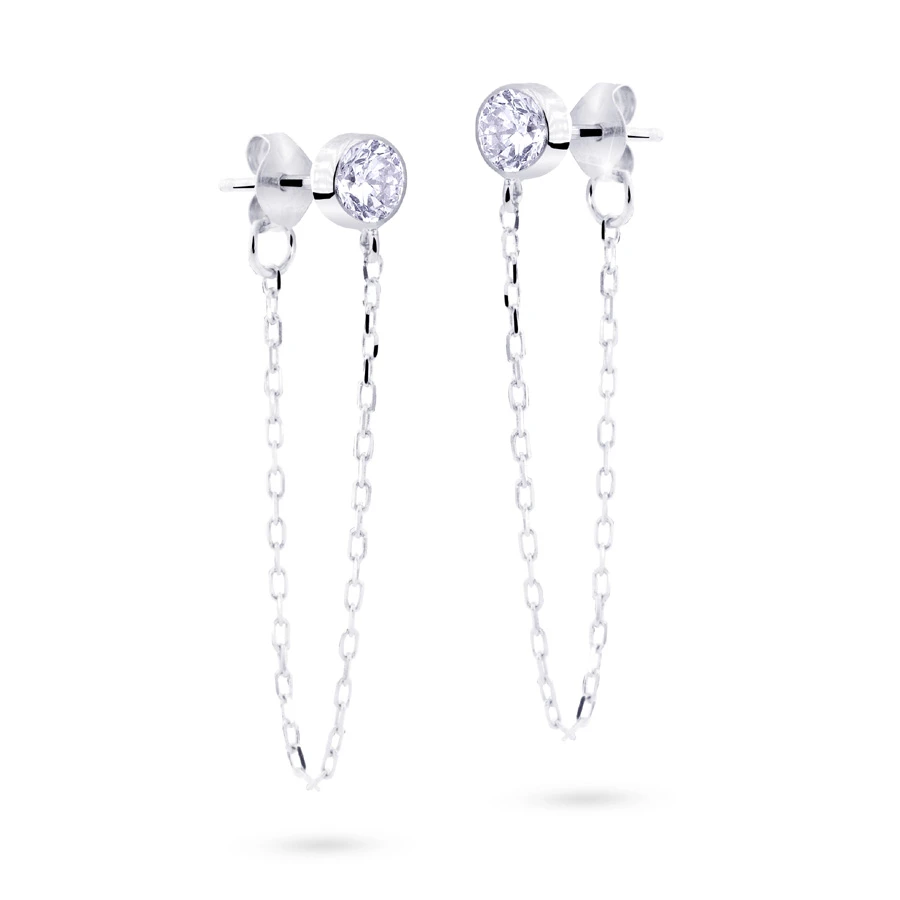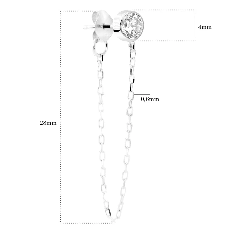 Zlaté visací náušnice se zirkony. Dlouhé náušnice s řetízkem, na kterém je připevněné náušnicové zapínání a nehrozí tak jeho nechtěná ztráta. Průměr ozdoby se zirkonem 4mm, délka náušnice 28mm. Náušnicové zapínání je na puzetky.
