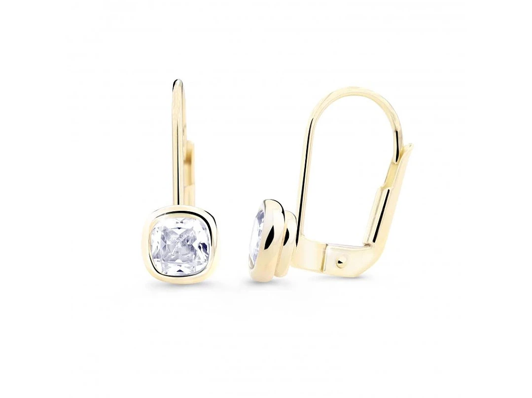 Zlaté visací náušnice vyrobené ze žlutého 14.ti karátového zlata. Náušnice jsou ozdobené prvotřídními zirkony. Náušnicové zapínání je na klapku. Ozdoba se zirkonem má rozměr 7x7mm, "výška" náušnic 15mm.