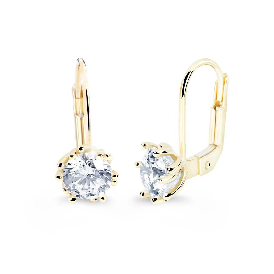 Zlaté náušnice se zirkony ze žlutého zlata ryzosti 585/1000. Elegantní zlaté visací náušnice ozdobené 6mm zirkony. Náušnicové zapínání je na klapku. Rozměry náušnic najdete zobrazené na podpůrné fotografii.