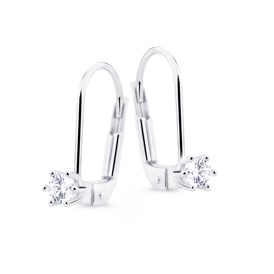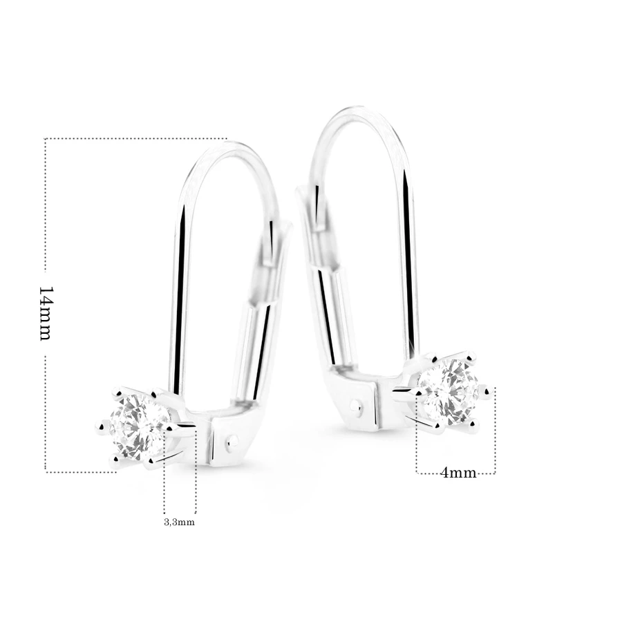 Náušnice se zirkony z bílého zlata ryzosti 585/1000. Elegantní zlaté visací náušnice ozdobené 4mm zirkony. Náušnicové zapínání je na klapku. Rozměry náušnic najdete zobrazené na podpůrné fotografii.