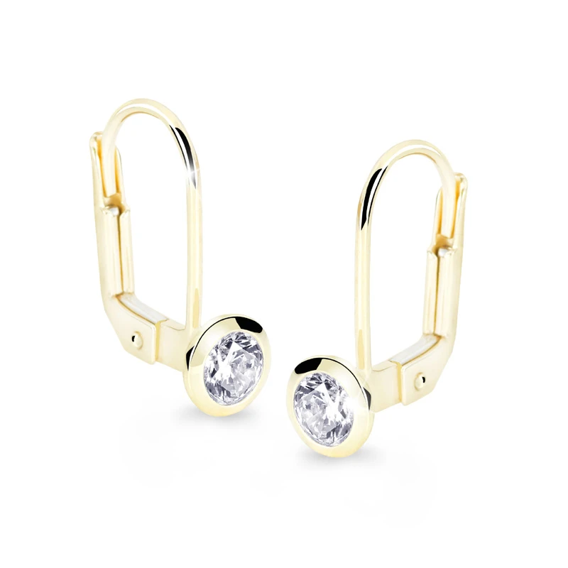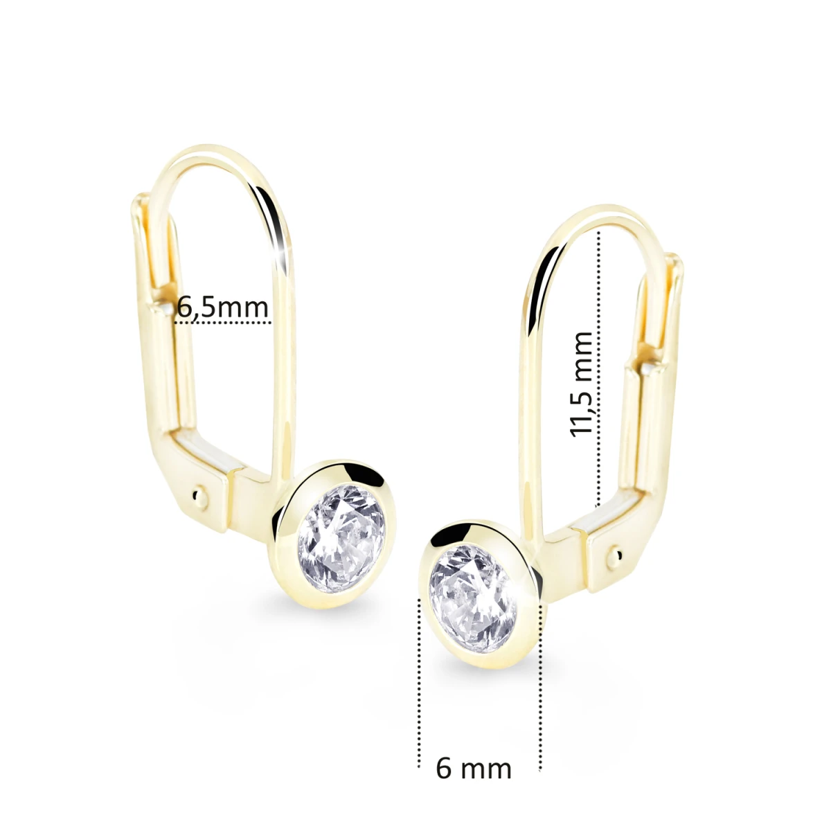 Náušnice ze žlutého zlata ryzosti 585/000. Dívčí zlaté náušnice se zirkony se zapínáním na klapku. Průměr ozdoby se zirkonem 6mm. Rozměry náušnic najdete zobrazené na podpůrné fotografii.