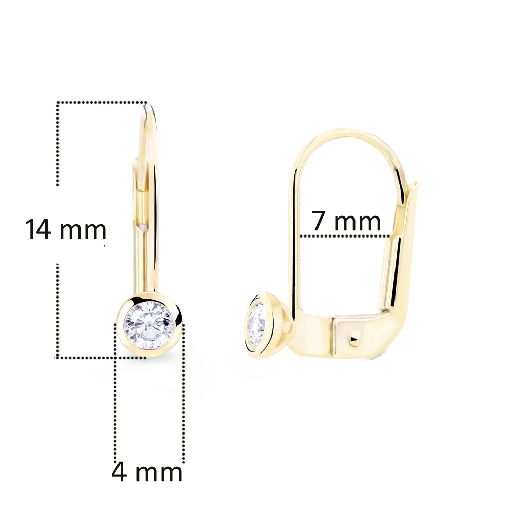 Náušnice ze žlutého zlata ryzosti 585/000. Dívčí zlaté náušnice se zirkony se zapínáním na klapku. Průměr ozdoby se zirkonem 4mm. Rozměry náušnic najdete zobrazené na podpůrné fotografii.