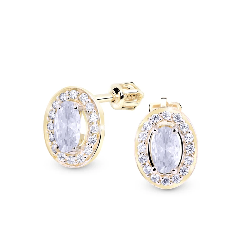 Zlaté náušnice se zirkony oválného tvaru. Náušnice jsou vyrobeny ze žlutého zlata 585/1000 a osazené jsou prvotřídními zirkony. Náušnicové zapínání je na šroubek. Výška náušnic 9mm, šířka 7mm.