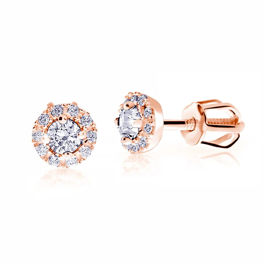 Náušnice z růžového zlata pecky se zapínáním na šroubek. Zlato je ryzosti 585/1000. Náušnicové zapínání na šroubek netlačí a pohodlně se nosí ve srovnání se zapínám na puzetky. Jemné zlaté náušnice pecky se zirkony. Rozměry náušnic najdete zobrazené na podpůrné fotografii.