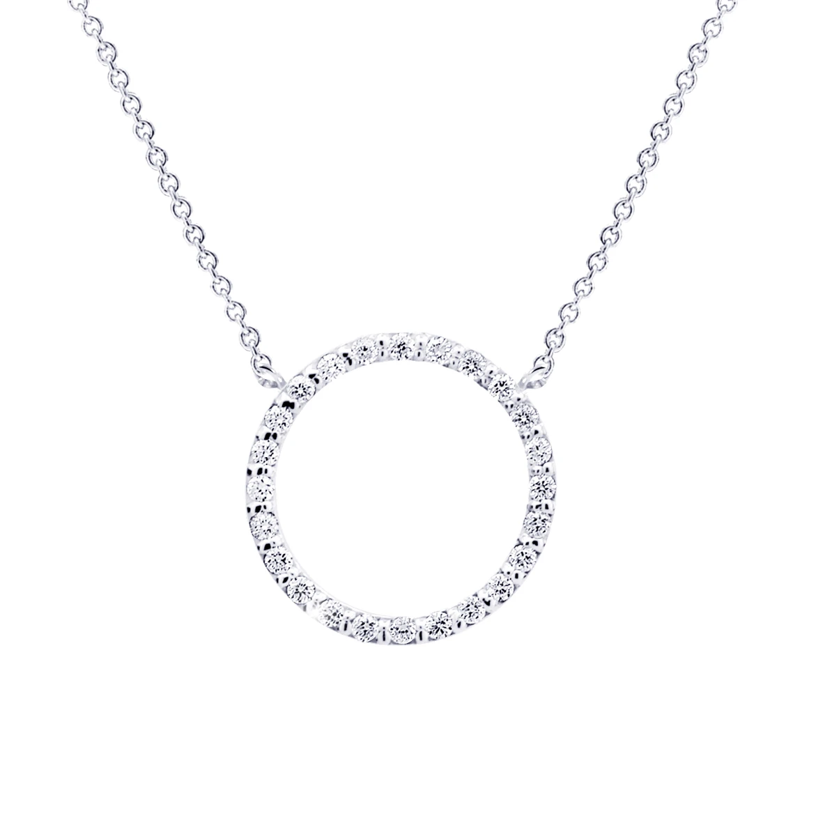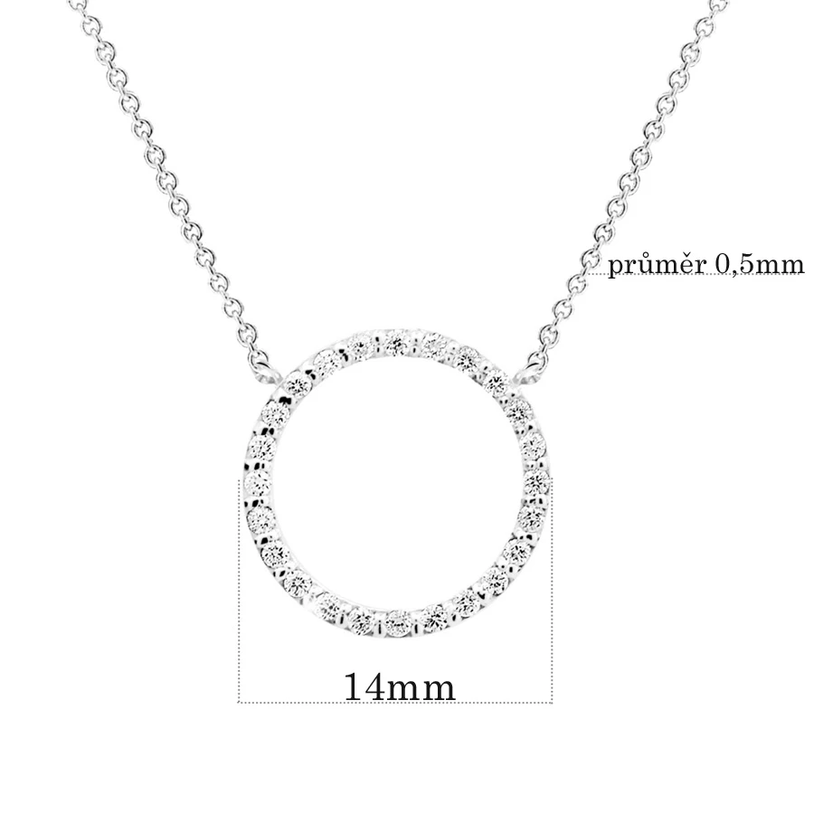 Náhrdelník celebritka z bílého zlata ryzosti 585/1000. Kruhová ozdoba náhrdelníku s průměrem 14mm je osazena zářivými zirkony. Jemný řetízek má průměr 0,5mm. Zapínání náhrdelníku je karabinové. Krásný zlatý náhrdelník pro každou ženu. Rozměry náhrdelníku najdete zobrazené na podpůrné fotografii.