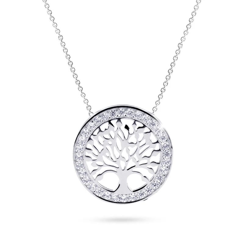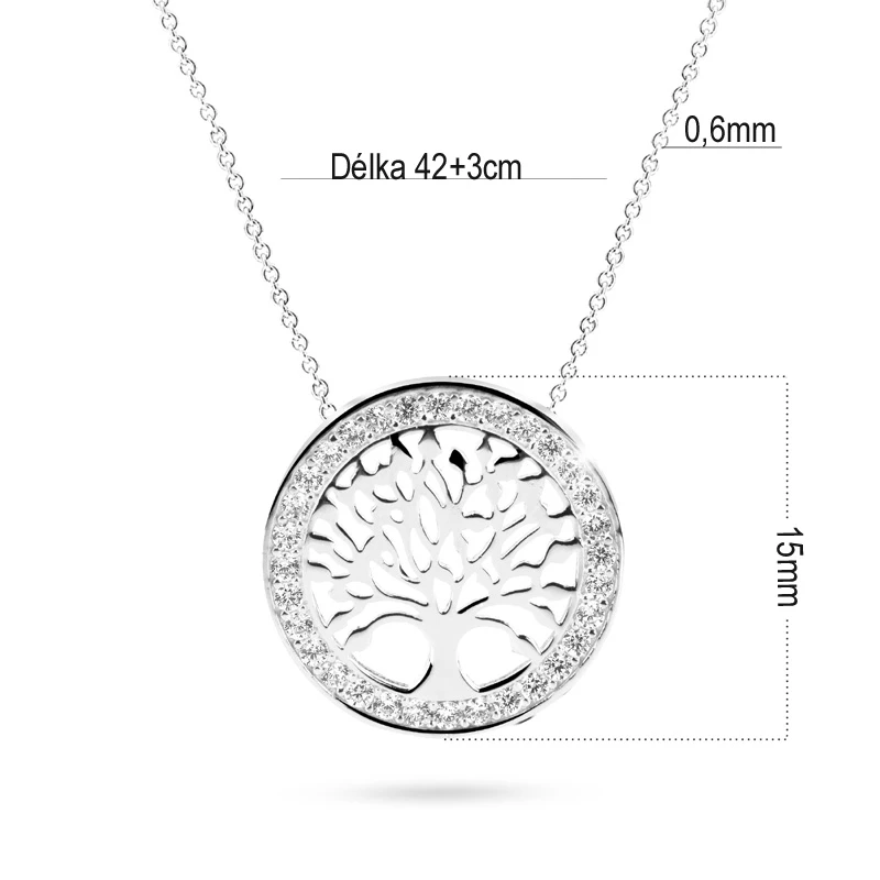 Náhrdelník z bílého zlata ryzosti 585/1000. Ozdoba se stromem života má průměr 15mm. Strom života je dokola osazený prvotřídními zirkony. Délku náhrdelníku lze pomocí nastavovacího řetízku měnit v rozmezí 42-45cm.