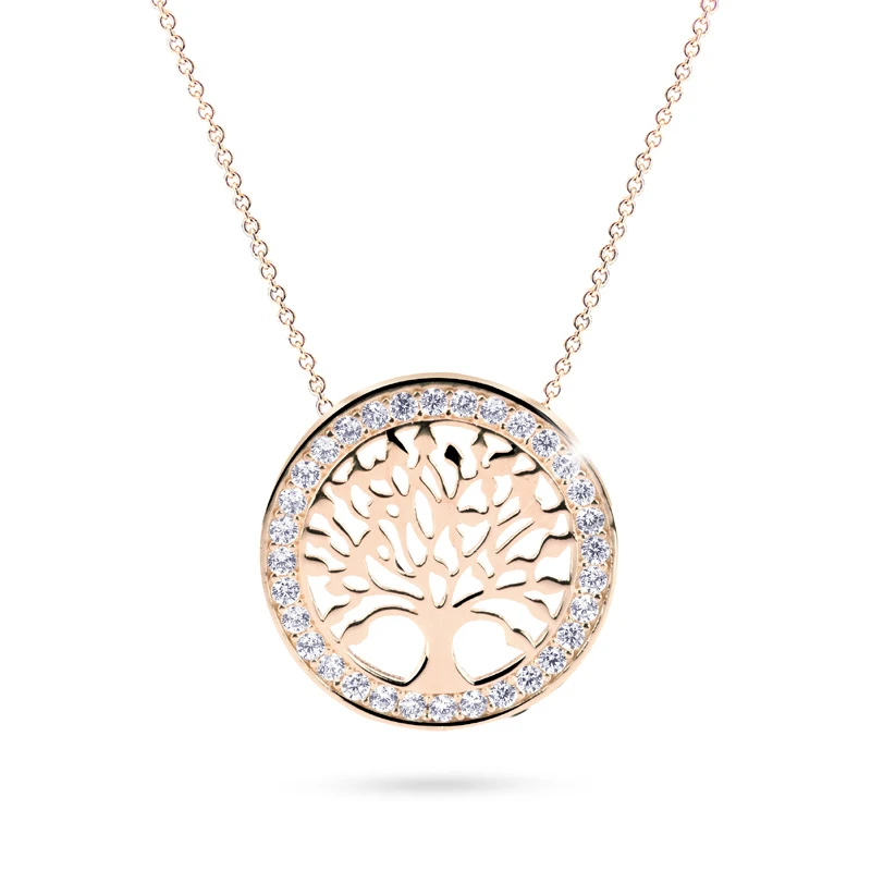 Náhrdelník z růžového zlata ryzosti 585/1000. Ozdoba se stromem života má průměr 15mm. Strom života je dokola osazený prvotřídními zirkony. Délku náhrdelníku lze pomocí nastavovacího řetízku měnit v rozmezí 42-45cm.