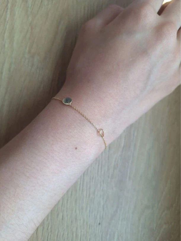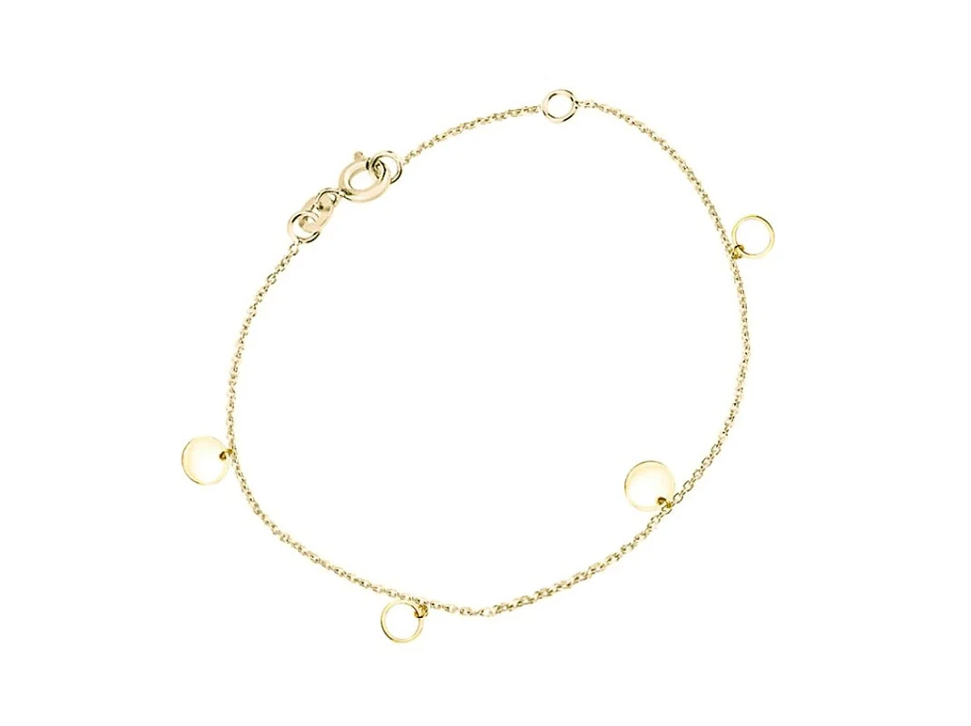 Jemný dámský náramek ze žlutého zlata ryzosti 585/1000. Náramek je ozdobený přívěsky ve tvaru penízků a kroužků. Penízky mají průměr 6mm, kroužky mají průměr 5mm. Řetízek je široký 1,0mm. Náramek lze díky vloženému očku zapnout v délce 16cm, nebo 18cm. Náramek se zapíná pomocí pérového kroužku.