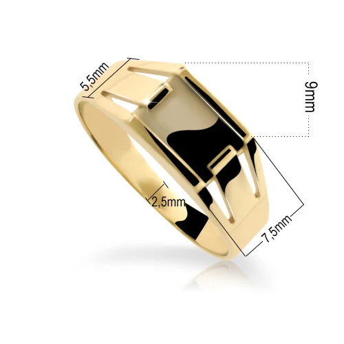 Zlatý prsten s onyxem. Prsten je vyrobený ze žlutého zlata 585/1000. Hladký leštěný povrch doplňuje lesklý onyx. Rozměr pečetidla s onyxem 9x7,5mm. Obroučka prstenu je v nejširším bodě široká 7,5mm a postupně se zužuje na 2,5mm. Rozměry prstenu najdete zobrazené na podpůrné fotografii.