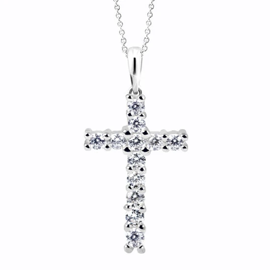 Přívěsek křížek z bílého zlata 585/000 osazený zirkony. Krásný zlatý přívěsek křížek na řetízek zvýrazněný třpytivými zirkony. Rozměr křížku 13x8 mm. Závěsné očko na přívěsku je vhodné pro zlatý řetízek s průměrem do 2,5 mm.