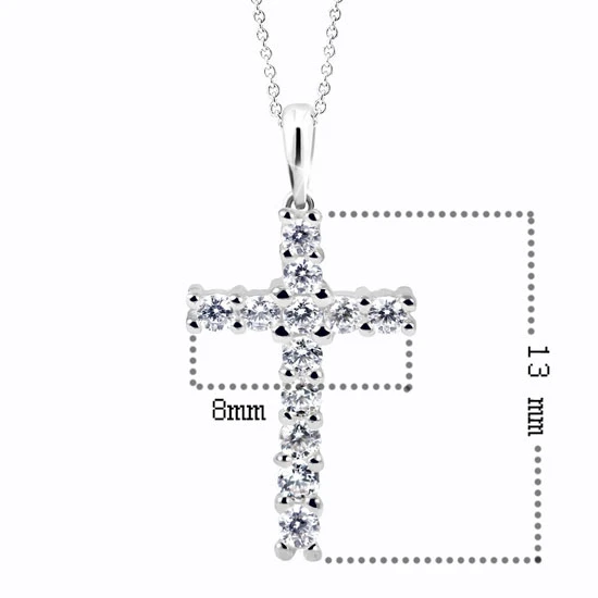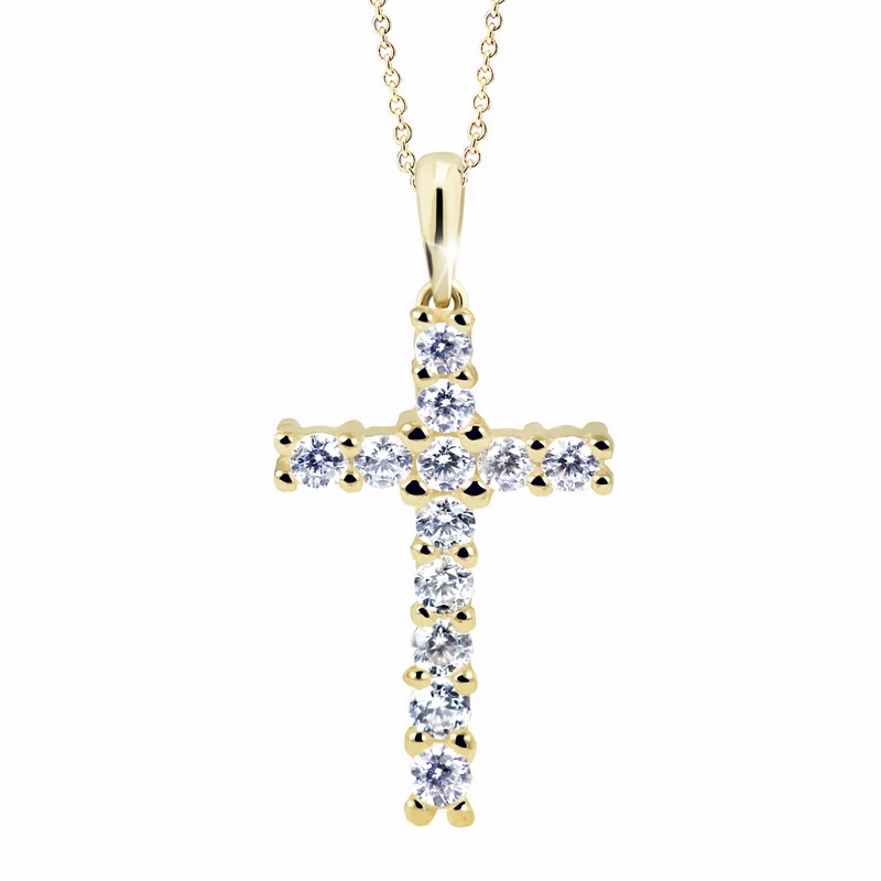 Přívěsek křížek ze žlutého zlata 585/000 osazený zirkony. Krásný zlatý přívěsek křížek na řetízek zvýrazněný třpytivými zirkony. Rozměr křížku 13x8 mm. Závěsné očko na přívěsku je vhodné pro zlatý řetízek s průměrem do 2,5 mm.