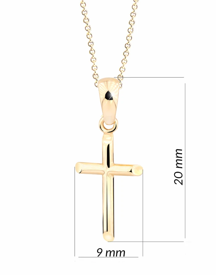 Přívěsek na krk křížek ze žlutého zlata 585/1000. Povrch přívěšku je leštěný. Rozměr křížku 20x9mm najdete vyobrazený na podpůrné fotografii. Závěsným očkem lze provléct zlatý řetízek s maximálním průměrem 2mm. Zlatý řetízek vhodný k přívěsku najdete v sekci zlaté řetízky.