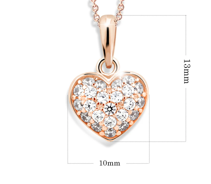 Přívěšek srdíčko z růžového zlata ryzosti 585/1000. Přívěsek je celý ozdobený zirkony. Závěsným očkem na přívěsku lze protáhnout zlatý řetízek s průměrem do 2,0mm. Srdíčko má rozměr 8x10mm. Celkové rozměry přívěsku najdete zobrazené na podpůrné fotografii.