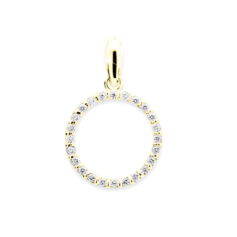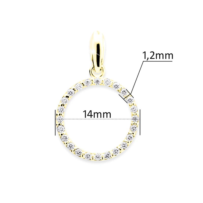 Přívěsek se zirkony ze žlutého zlata ryzosti 585/1000. Vnější průměr přívěsku 14mm, obroučka široká 1,2mmje hustě osazená třpytivými zirkony. Zlatý řetízek vhodný k přívěsku najdete v kategorii řetízky. Přívěsek zdarma zabalíme do dárkové krabičky a papírové tašky.