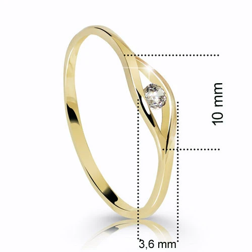 Zlatý zásnubní prsten ze žlutého zlata 585/1000 osazený kvalitním diamantem. Rozměry prstenu najdete vyobrazené na podpůrném obrázku. Briliant zasazený v prstenu má hmotnost 0,060 ct hodnoceným na základě tvz, 4C tříd: