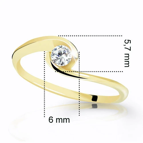 Zlatý zásnubní prsten ze žlutého zlata 585/1000 osazený kvalitním diamantem. Rozměry prstenu najdete vyobrazené na podpůrném obrázku. Briliant zasazený v prstenu má hmotnost 0,060 ct hodnoceným na základě tvz, 4C tříd: