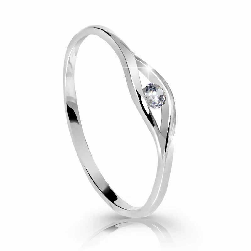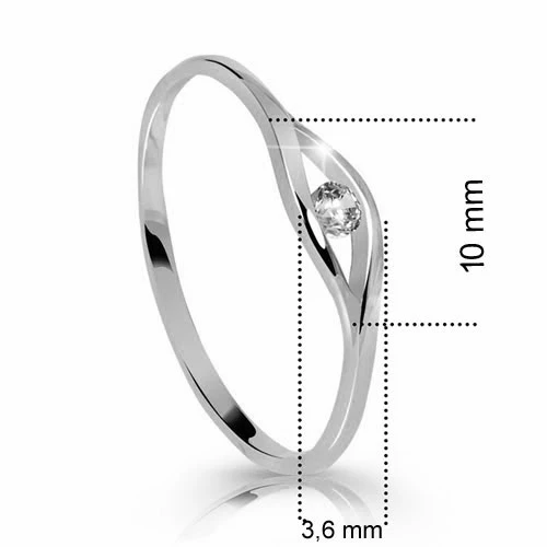 Prstýnek z bílého zlata osazený zirkonem. Obroučka prstenu je široká 1,7 mm, rozměr ozdobné části se zirkonem 3,6x10 mm.