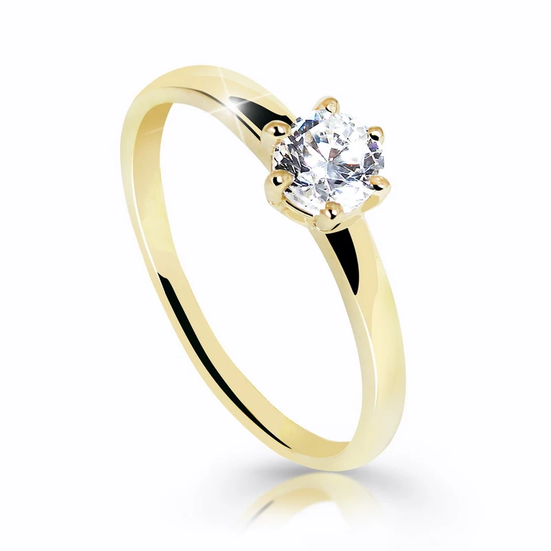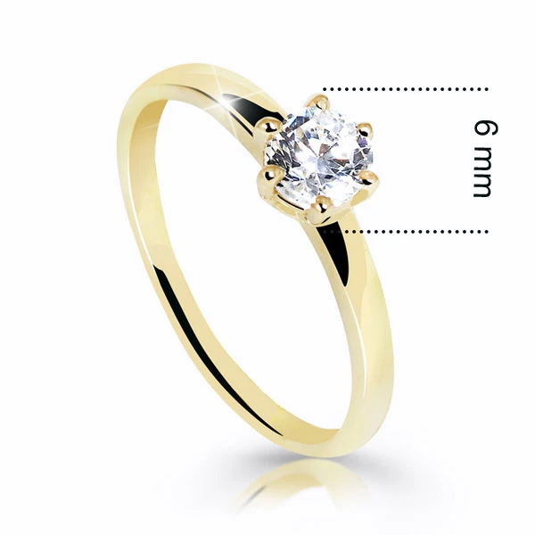Prstýnek ze žlutého zlata se zirkonem. Obroučka prstenu je široká 1,9 mm. Průměr ozdoby se zirkonem 6 mm.