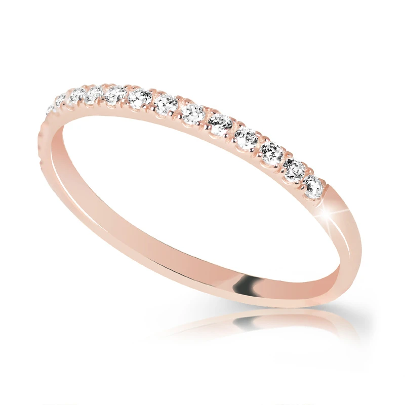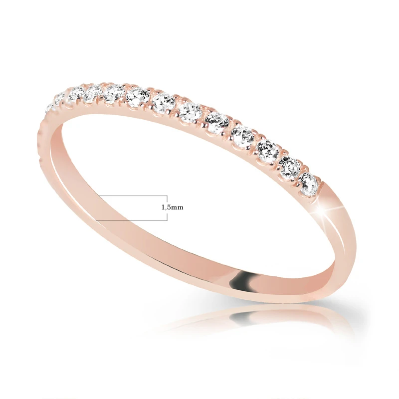 Zlatý prstýnek se zirkony z růžového zlata ryzosti 585/1000. Jemný dámský prstýnek široký 1,5mm, který díky zářivým zirkonům určitě nepřehlédnete.