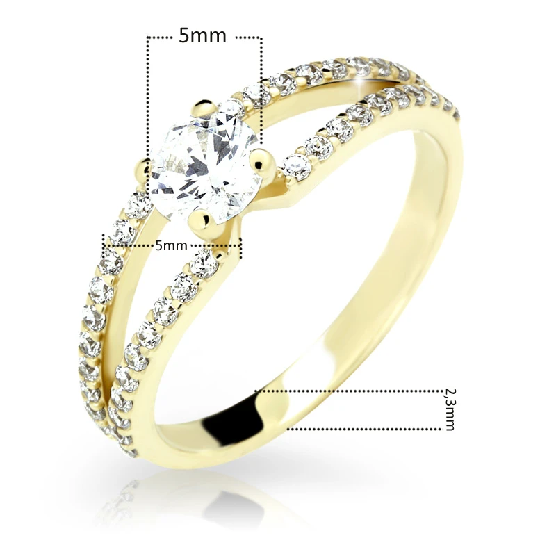 Zlatý prstýnek ze žlutého zlata ryzosti 585/1000 se zirkony. Obroučka prstýnku je v nejužším místě široká 2,3mm a postupně se rozšiřuje na 5mm. Rozměry prstýnku najdete na podpůrné fotografii.