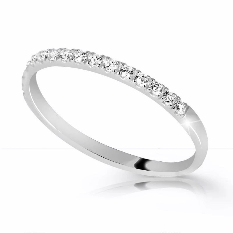 Prstýnek z bílého zlata ozdobený zirkony. Obroučka prsten je široká 2,0 mm.