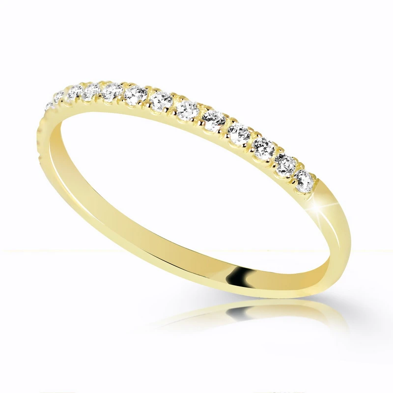 Prstýnek ze žlutého zlata ozdobený zirkony. Obroučka prstenu je široká 2,0 mm.