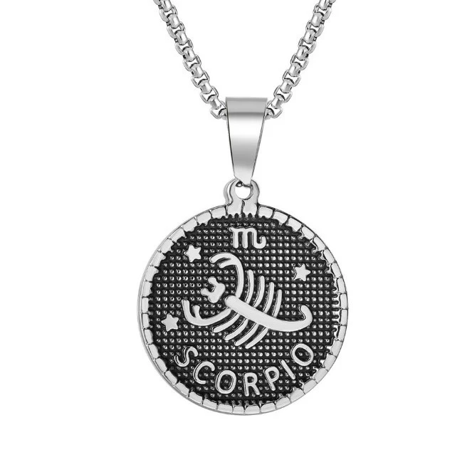 Náhrdelník z chirurgické oceli se znamením Štíra. Jako všechny šperky z chirurgické oceli je také tento přívěsek a řetízek odolný proti poškození, nevyvolává alergické reakce, neoxiduje a je barevně stálý.