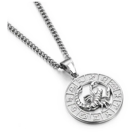 Přívěsek se znamením štíra (24.10-22.11). Přívěsek je vyrobený z chirurgické oceli. Znamení štíra je "lemováno" symboly ostatních znamení zvěrokruhu. Součástí znamení je řetízek z chirurgické oceli vzor pancr se zapínáním na karabinu, dlouhý 60cm. Přívěsek má průměr 30mm. Na přání je možné řetízek zdarma zkrátit.