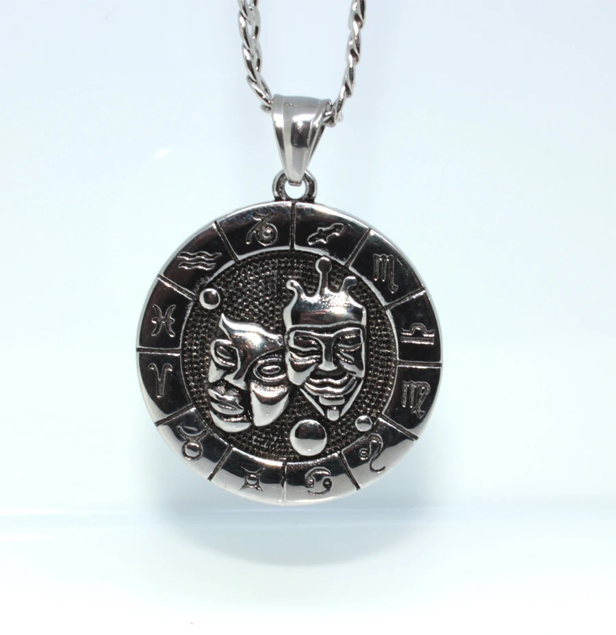 Přívěsek se znamením blížence (22.5 - 22.6). Přívěsek je vyrobený z chirurgické oceli. Znamení blíženců je "lemováno" symboly ostatních znamení zvěrokruhu. Součástí znamení je řetízek z chirurgické oceli vzor pancr se zapínáním na karabinu, dlouhý 60cm. Přívěsek má průměr 34mm. Na přání je možné řetízek zdarma zkrátit.