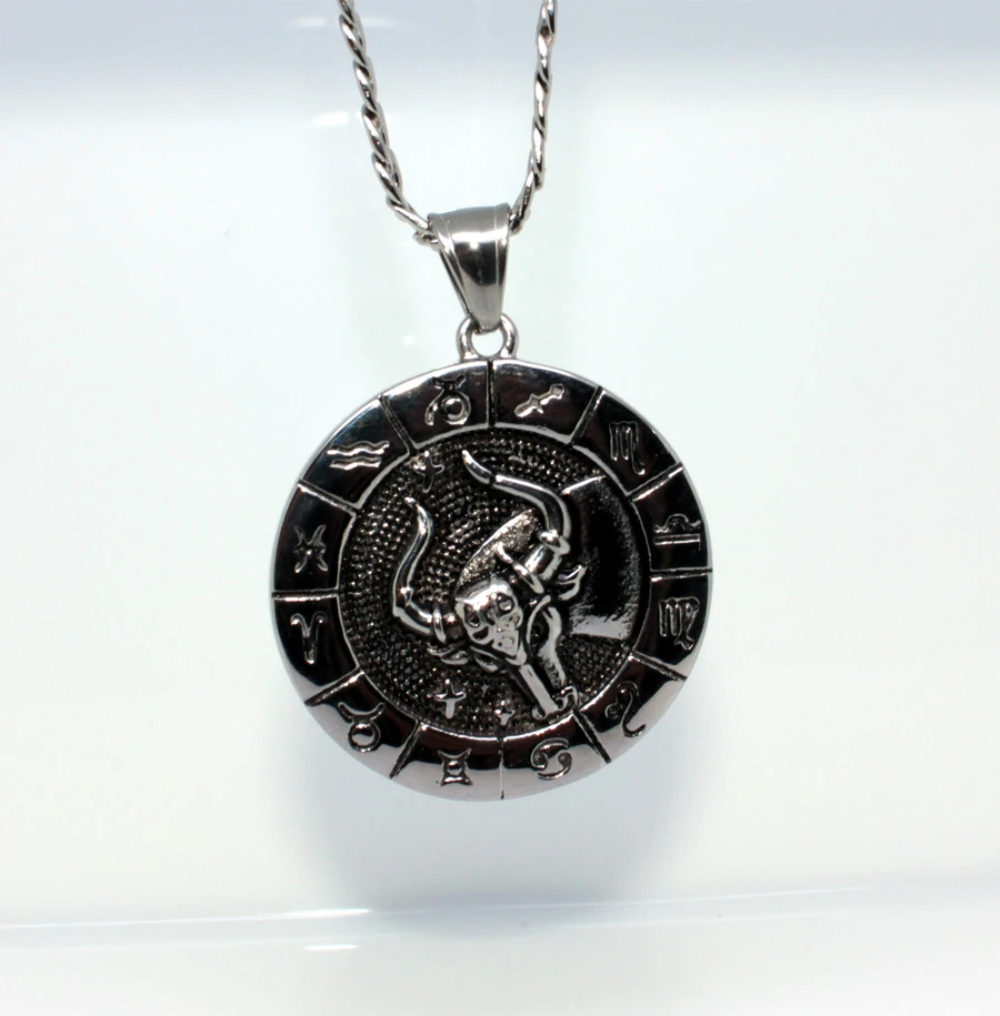 Přívěsek se znamením býka (21.4 - 21.5). Přívěsek je vyrobený z chirurgické oceli. Znamení býka je "lemováno" symboly ostatních znamení zvěrokruhu. Součástí znamení je řetízek z chirurgické oceli vzor pancr se zapínáním na karabinu, dlouhý 60cm. Přívěsek má průměr 34mm. Na přání je možné řetízek zdarma zkrátit.