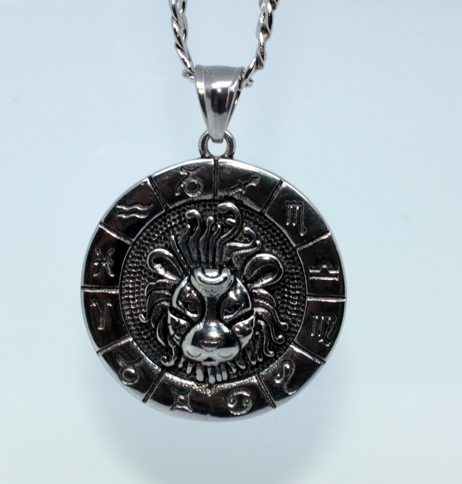 Přívěsek se znamením lva (23.7 - 22.8). Přívěsek je vyrobený z chirurgické oceli. Znamení býka je "lemováno" symboly ostatních znamení zvěrokruhu. Součástí znamení je řetízek z chirurgické oceli vzor pancr se zapínáním na karabinu, dlouhý 60cm. Přívěsek má průměr 34mm. Na přání je možné řetízek zdarma zkrátit.
