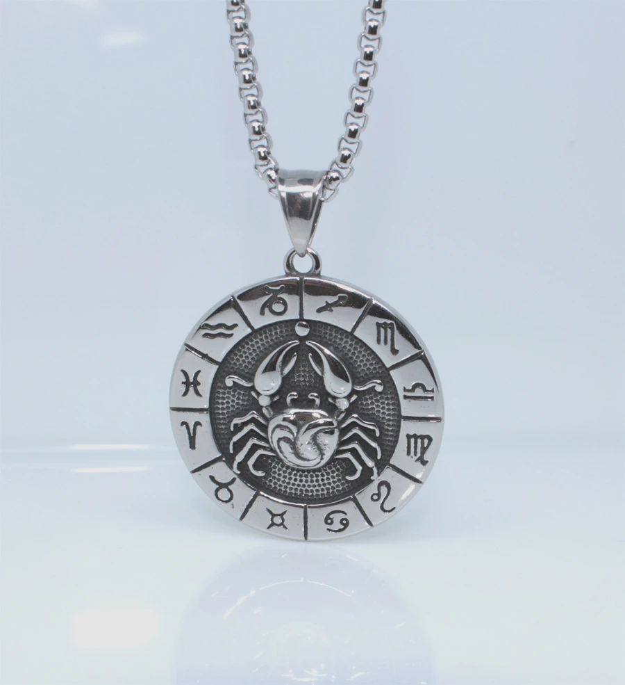 Přívěsek se znamením Raka (22.6 - 22.7). Přívěsek je vyrobený z chirurgické oceli. Znamení raka je "lemováno" symboly ostatních znamení zvěrokruhu. Součástí znamení je řetízek z chirurgické oceli vzor pancr se zapínáním na karabinu, dlouhý 60cm. Přívěsek má průměr 34mm. Na přání je možné řetízek zdarma zkrátit.